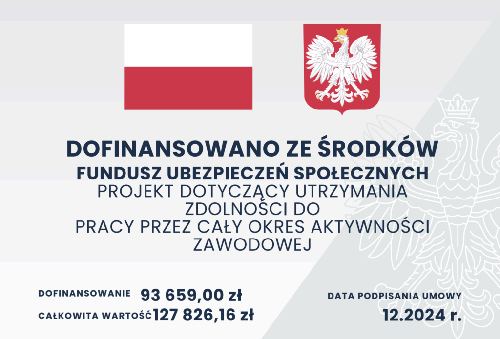Środki pochodzące z projektu „Dotyczącego utrzymania zdolności do pracy przez cały okres aktywności zawodowej” zostały przeznaczone na zakup nowego sprzętu, który poprawi bezpieczeństwo i komfort pracy naszego zespołu. Zakupiliśmy: